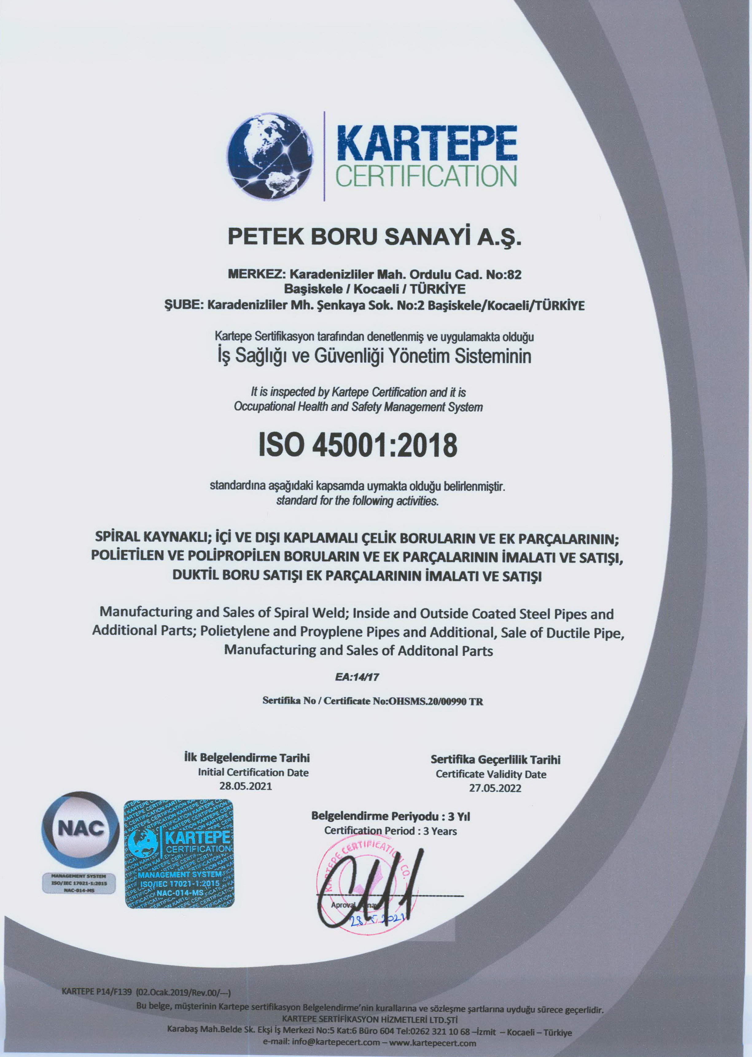 Entegre Yönetim Sistemi yeniden belgelendirme tetkiki sonucunda, ISO 9001 Kalite Yönetim Sistemi, ISO 14001 Çevre Yönetim Sistemi ve ISO 45001 İş Sağlığı ve Güvenliği Yönetim Sistemi sertifikasyonlarımız yenilenmiştir.